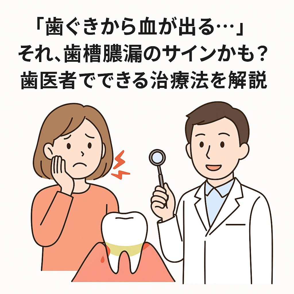 皆さん、「歯ぐきから血が出る」という経験はありませんか?実はその症状、歯槽膿漏(しそうのうろう)のサインかもしれません。歯槽膿漏は、歯を支える骨や歯ぐきが炎症を起こし、放っておくと歯がぐらついたり抜けてしまう怖い病気です。当院にも「痛みはないけれど歯ぐきから血が出る」と相談に来られる患者様が多くいらっしゃいます。早期に治療を始めれば進行を止めることができ、健康な口元を取り戻すことが可能です。今回は、歯ぐきの出血と歯槽膿漏の関係、そして歯医者での治療法についてわかりやすく解説します。この記事が皆様の参考になれば幸いです。